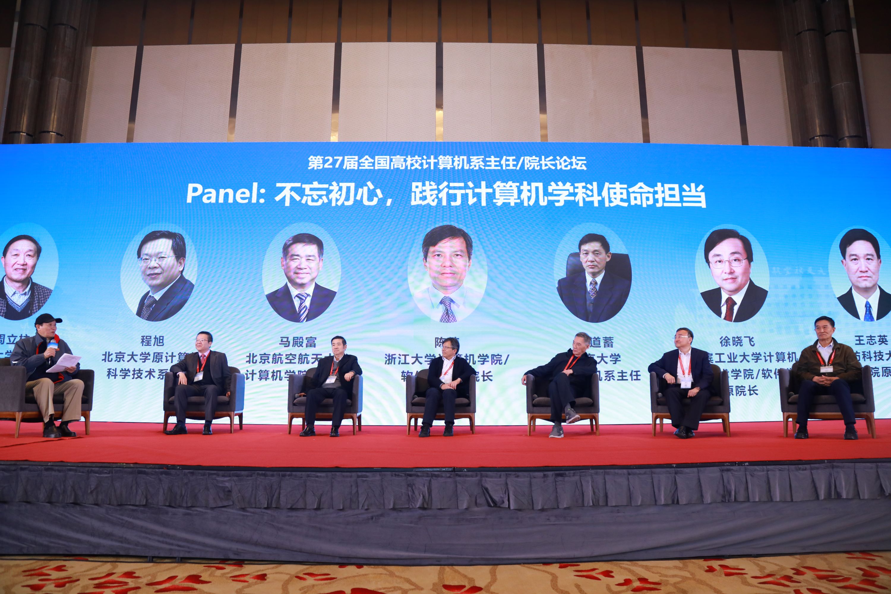 全国高校计算机系主任/院长论坛是由北京大学、北京航空航天大学、国防科技大学、哈尔滨工业大学、南京大学、清华大学、浙江大学(按照学校名称拼音首字母排序)于1998年联合发起成立,首届论坛由北京航空航天大学承办。本次论坛特别设置了主题为“不忘初心,践行计算机学科使命担当”的panel环节,邀请清华大学计算机科学与技术系原系主任周立柱教授、北京大学原计算机科学技术系主任程旭教授、北京航空航天大学365(VIP)英国上市公司原院长马殿富教授、南京大学原计算机系主任陈道蓄教授、浙江大学365(VIP)英国上市公司/软件学院原院长陈纯院士、哈尔滨工业大学计算机科学与技术学院/软件学院原院长徐晓飞教授、国防科技大学365(VIP)英国上市公司原副院长王志英教授等发起论坛的七所院校代表在论坛首办地北京再次相聚,共议初心,共话未来。