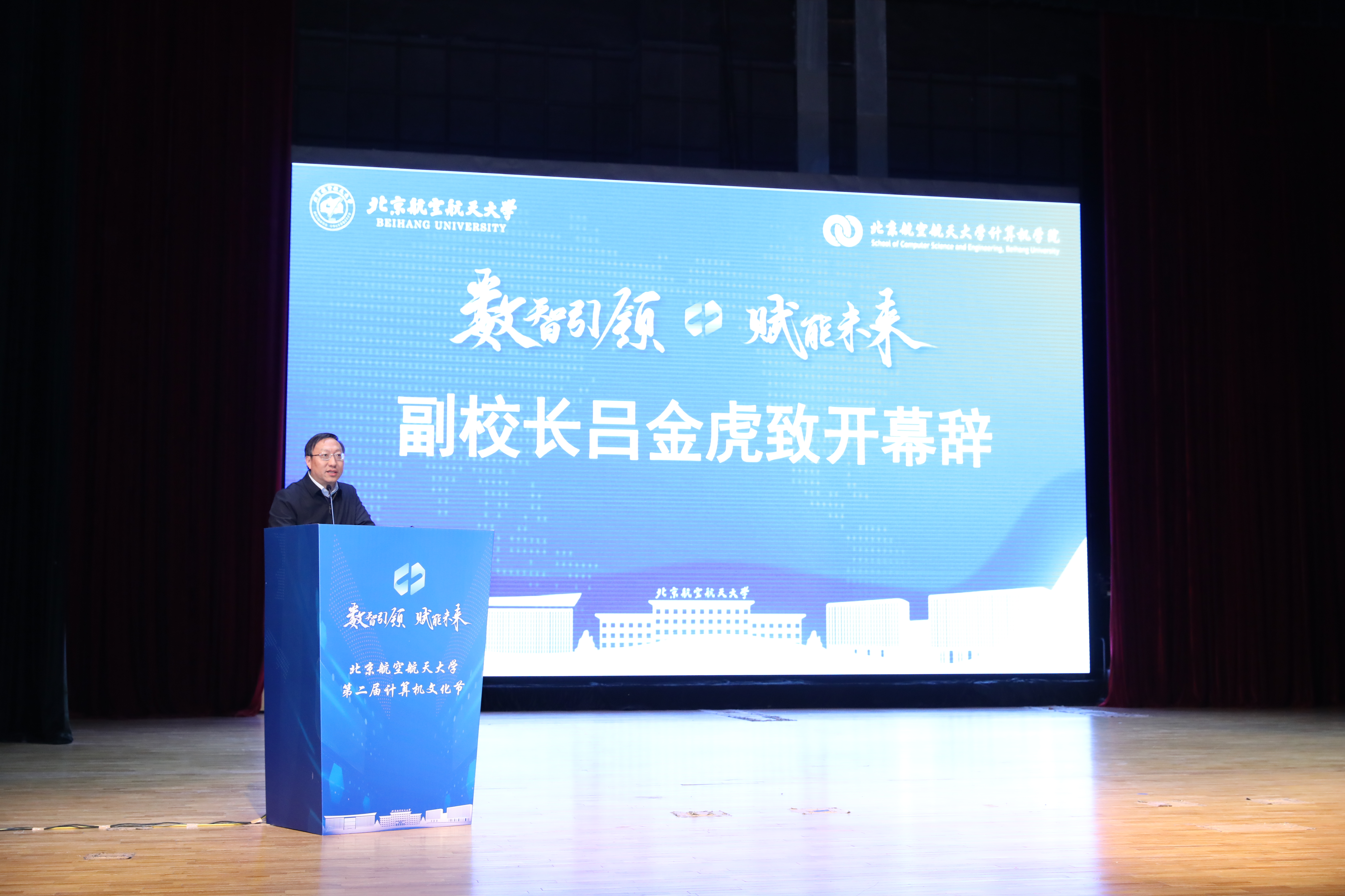 吕金虎为开幕式致辞,他指出人工智能、大数据等计算机技术正成为推动新质生产力的核心引擎,本届文化节“数智引领,赋能未来”的主题与北航“数智赋能年”战略同频共振。他对文化节提出三点期望:一是以数智强引领,推动技术变革;二是以创新促发展,培养引领型人才;三是以融通聚势能,构建多元协同育人生态。致辞最后,吕金虎郑重宣布“北京航空航天大学第二届计算机文化节开幕!”