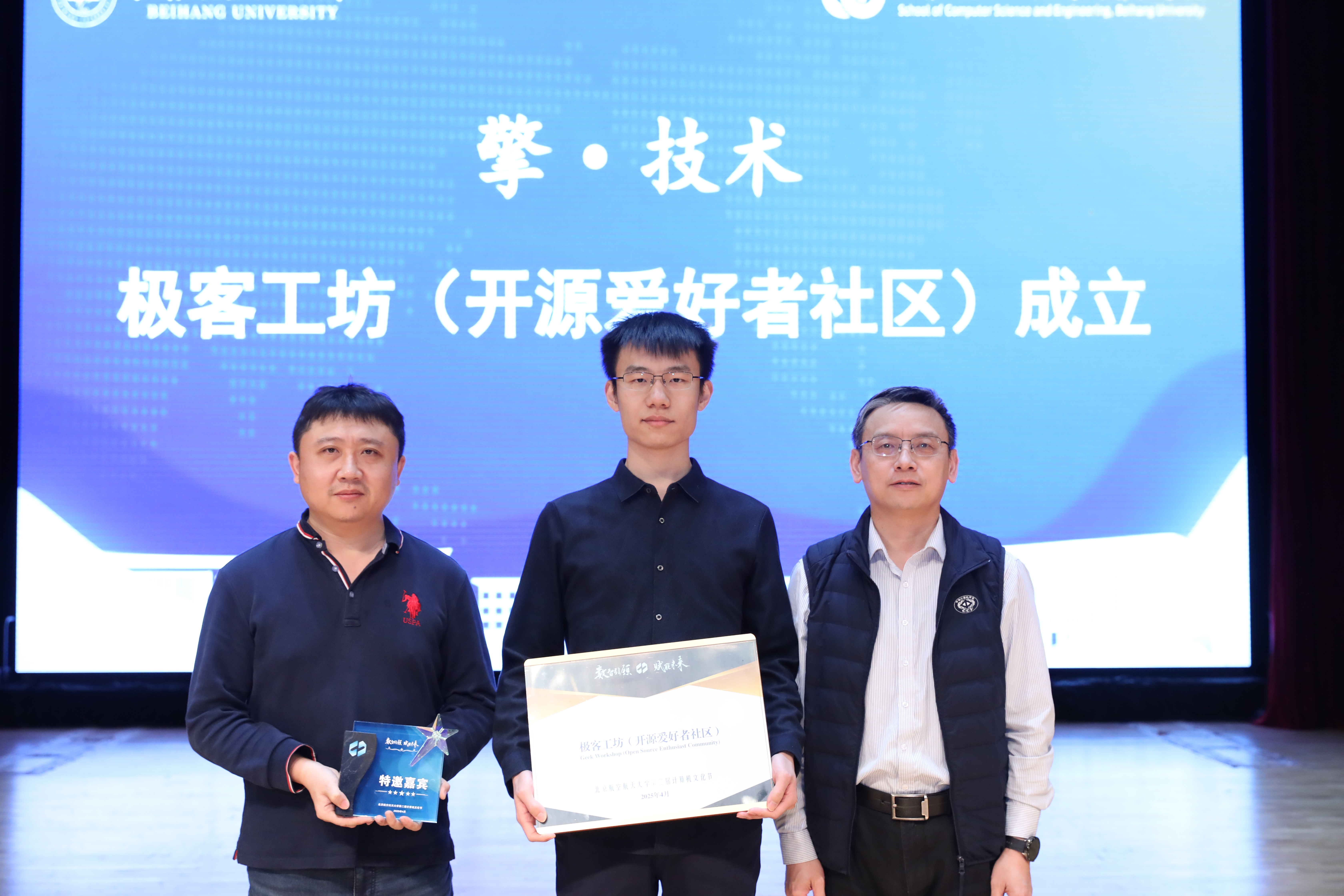 在技术板块,成立“极客工坊”开源社区,推动技术攻关与开源生态建设,丁肇辉担任技术板块荣誉顾问。他表示华为昇腾会为开源社区提供持续支持,并鼓励学生坚持开源精神,助力国产软件发展。软件学院院长胡春明为极客工坊学生代表及荣誉顾问授牌。