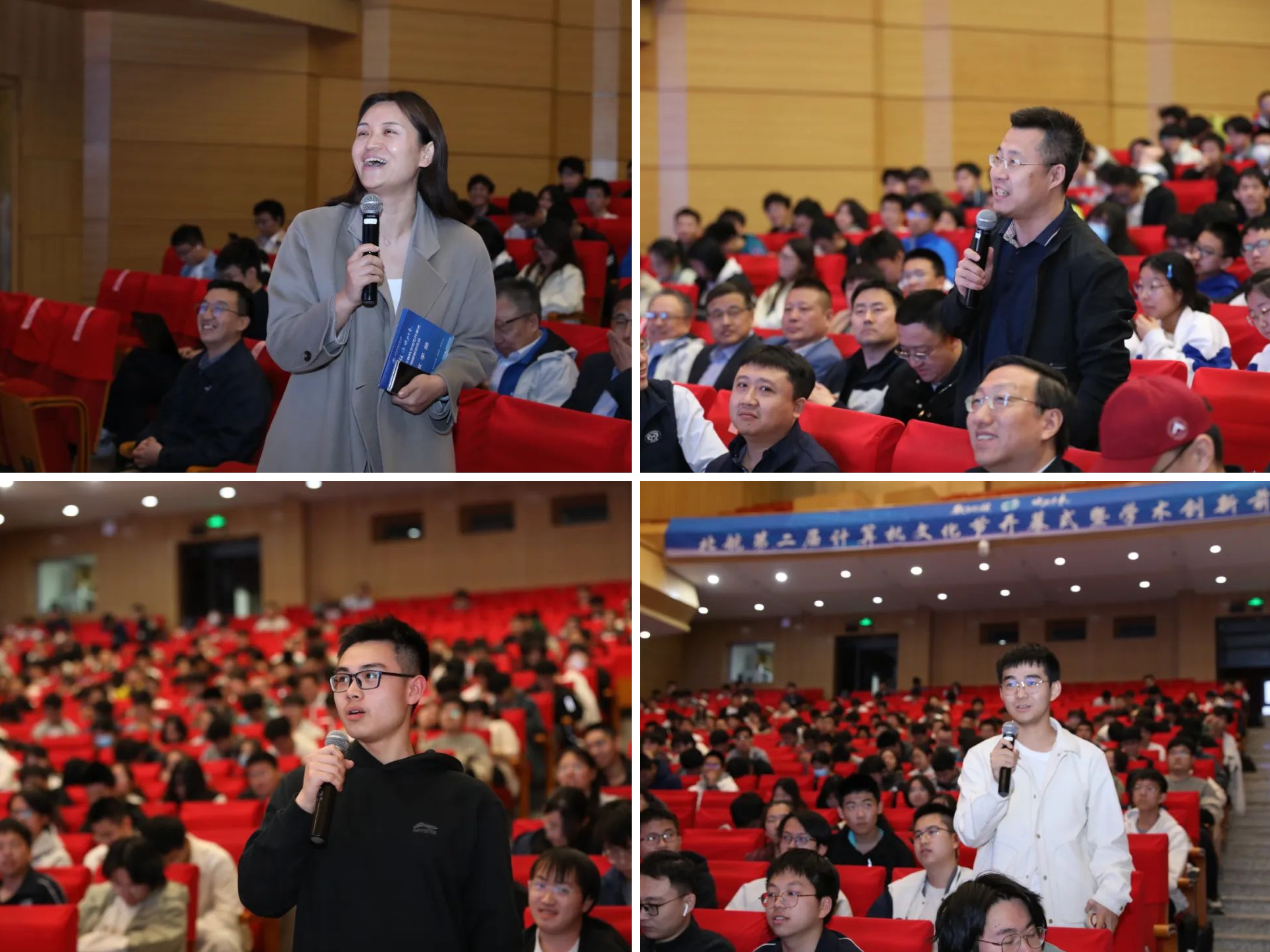 在交流环节,学生与校友同樊文飞和丁肇辉热烈讨论。樊文飞强调如何根据现有的数据,提供更好的中文训练语料是我国大模型发展的关键问题之一。他激励同学们要以全球视野锚定人类发展重大命题,在科技变革的浪潮中,成为能够引领世界的领军领导人才。丁肇辉针对学生“软件架构学习需哪些前置技能”问题,建议同学们要夯实工科基础,特别建议加强计算机组成原理与体系架构的学习。