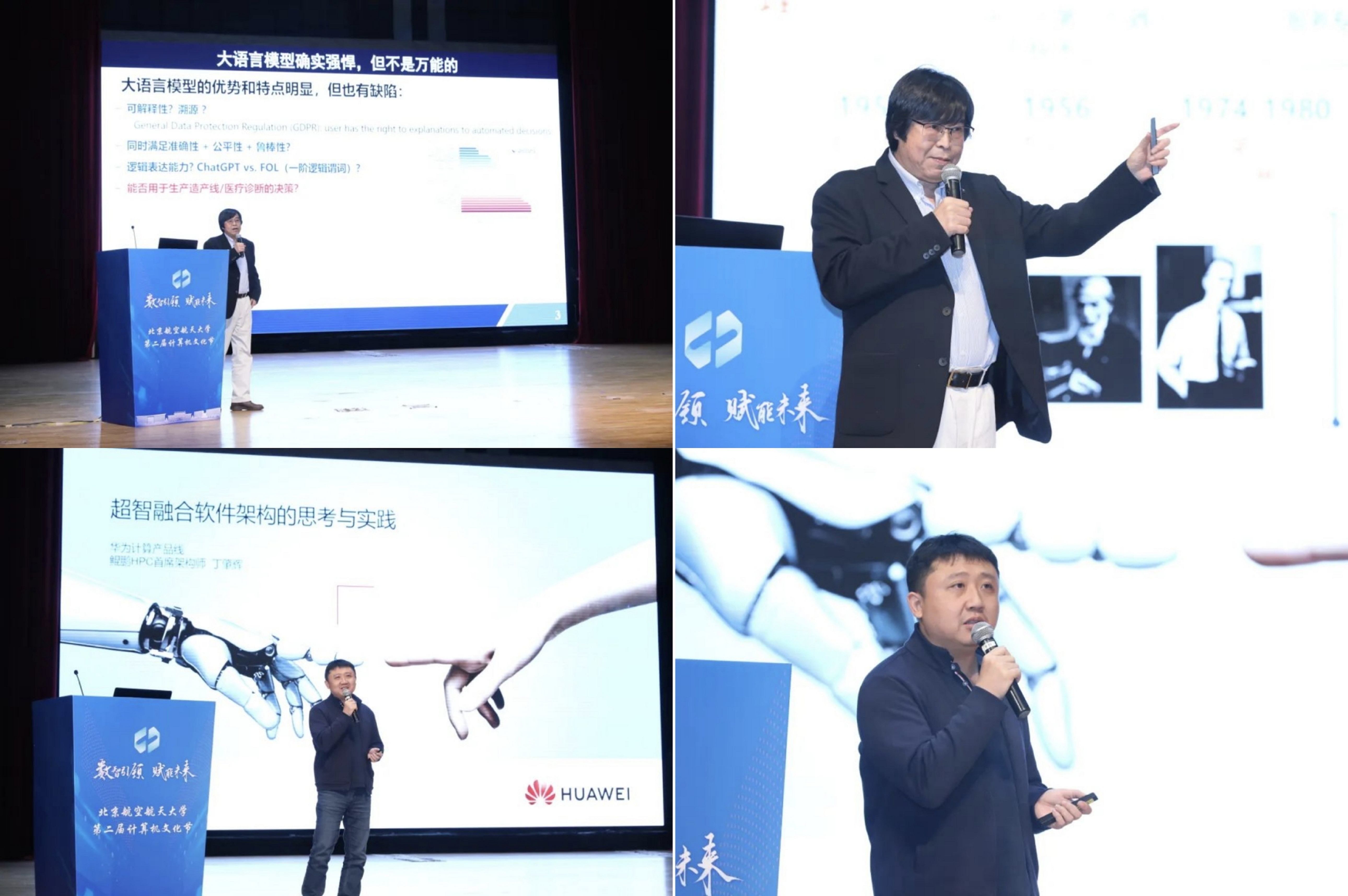 开幕式结束后,学术创新前沿论坛正式开始。樊文飞和丁肇辉带来了精彩的学术前沿报告。樊文飞以《跳出大模型:AI领域的研究方向探索》为题,系统梳理AI技术演进,提出构建“自动化、低成本、可解释”的工业智能体系,并强调数据治理“中国方案”的重要性。他以自主研发的“崖山”系统为例,指出基础软件对产学研协同的关键作用。丁肇辉在《超智融合软件架构的思考与实践》报告中,分析HPC与AI融合趋势,探讨超智融合架构的技术挑战与创新路径,并介绍华为鲲鹏统一并行库(KUPL)在动态负载均衡、多域协同等领域的突破。