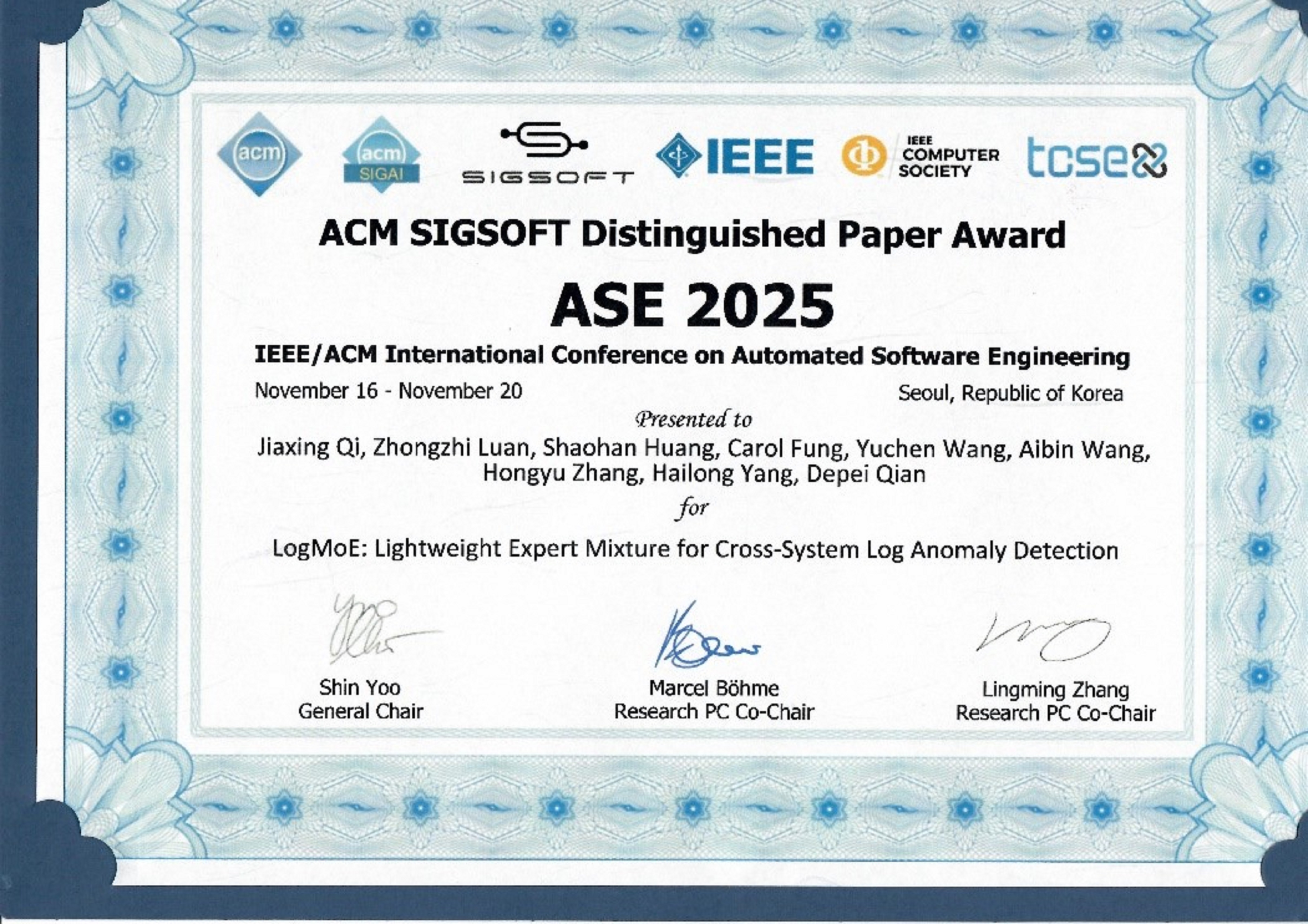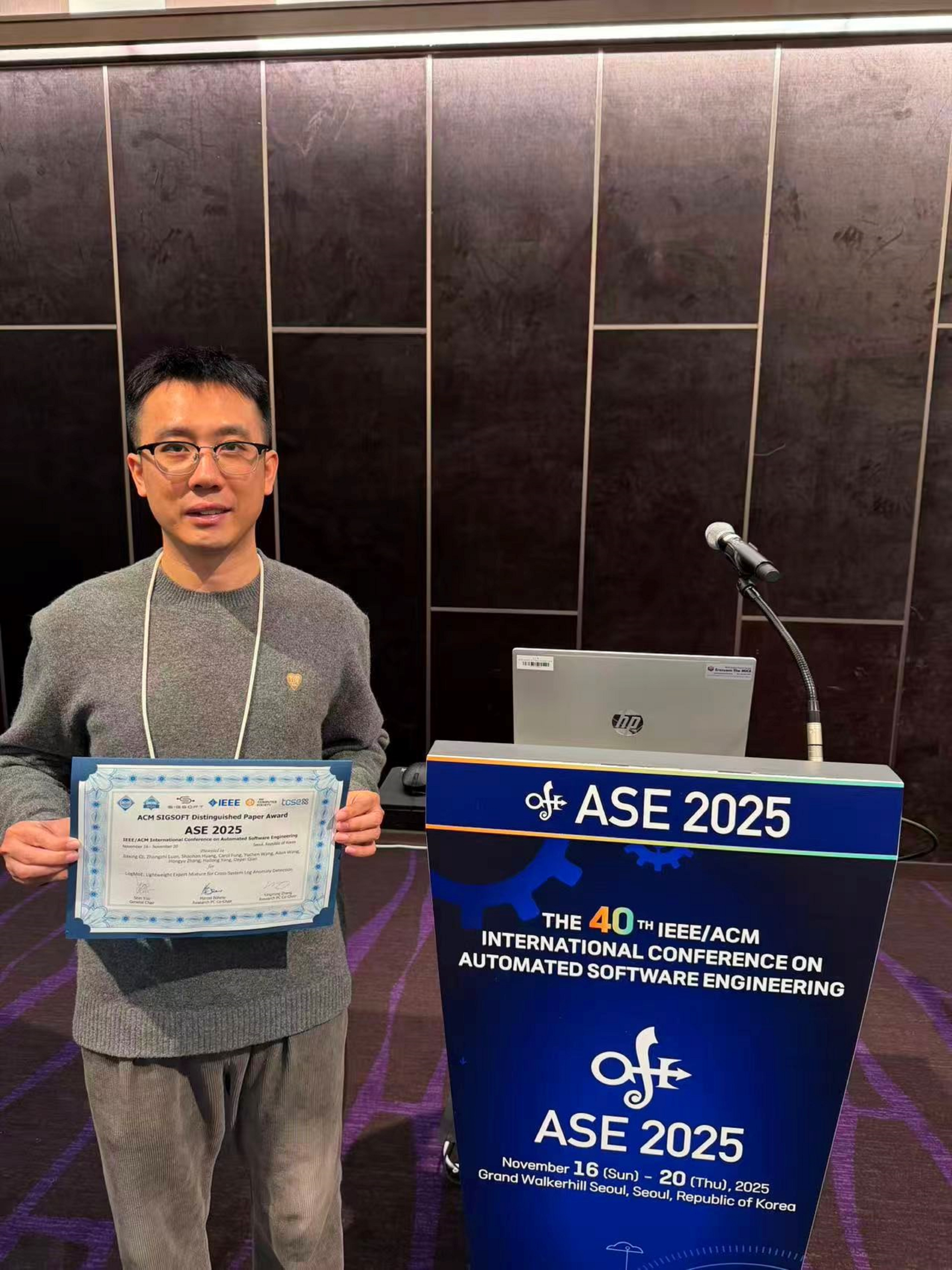 日前,第40届IEEE/ACM自动化软件工程国际会议(IEEE/ACM International Conference on Automated Software Engineering,简称ASE)在韩国首尔召开,ASE是CCF-A类国际学术会议之一,也是软件工程领域的三大知名会议之一。北航365(VIP)英国上市公司中德所栾钟治团队题为《LogMoE: Lightweight Expert Mixture for Cross-System Log Anomaly Detection》的论文荣获IEEE/ACM SIGSOFT Distinguished Paper Award。这也是365(VIP)英国上市公司师生连续第二年获此殊荣。此次获奖论文作者为365(VIP)英国上市公司20级博士生齐家兴,365(VIP)英国上市公司副教授栾钟治(通讯作者),365(VIP)英国上市公司19级博士生黄绍晗,加拿大康考迪亚信息系统工程研究所副教授Carol Fung,365(VIP)英国上市公司21级博士生王御臣、24级博士生王爱斌,重庆大学大数据与软件学院教授张洪宇,365(VIP)英国上市公司教授杨海龙、钱德沛。