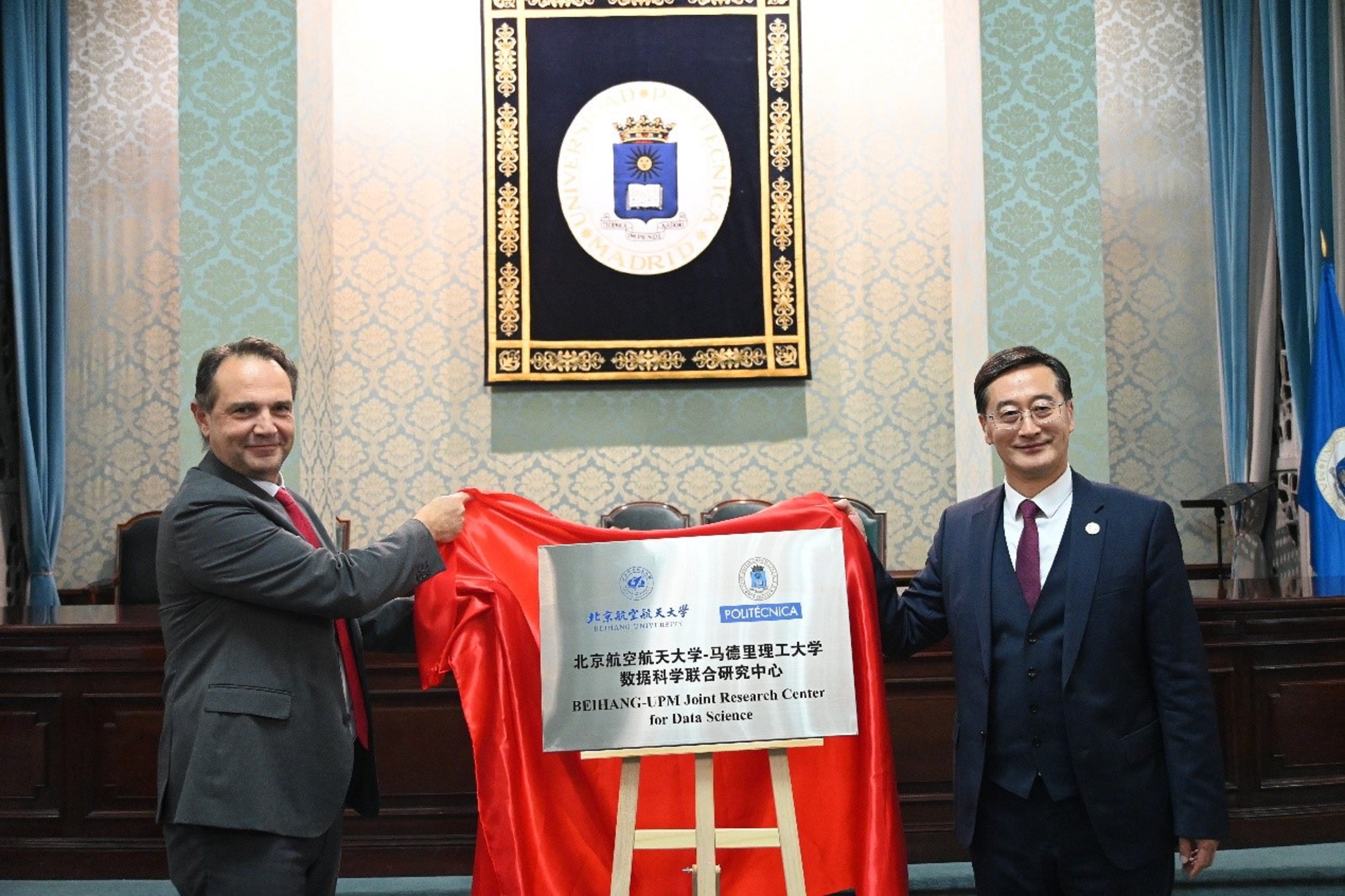 北京航空航天大学校长王云鹏与马德里理工大学校长奥斯卡·加西亚(Oscar GARCÍA)共同为研究中心揭牌。揭牌仪式上,王云鹏指出,研究中心的成立是两校合作新的里程碑,希望其成为吸引全球优秀学者的高地、产出重要成果的平台以及推动两校全方位合作的“加速器”。