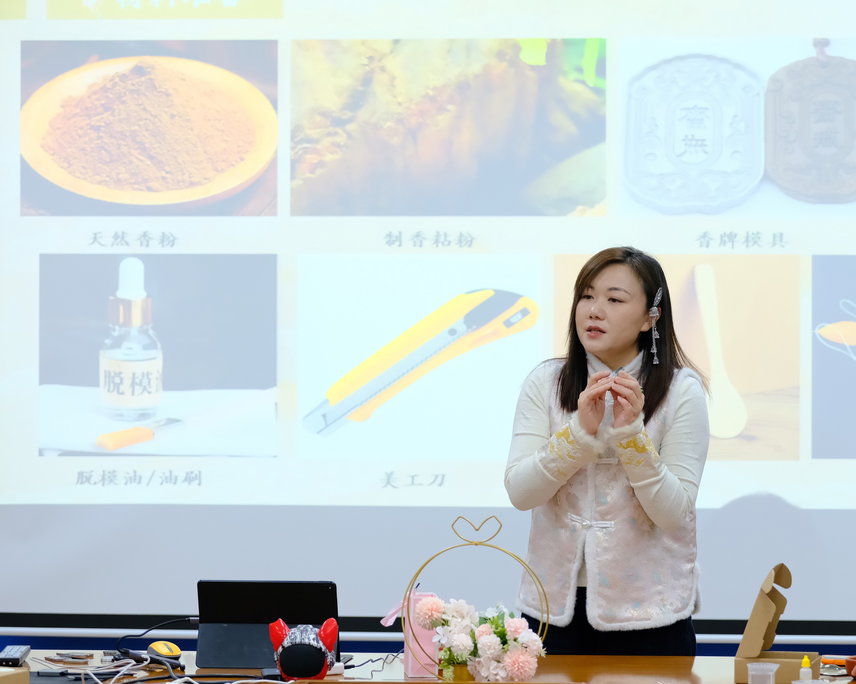 活动伊始,指导老师为大家详细介绍了香文化的深厚底蕴。中国香文化历史悠久,与茶文化、插花文化并称为中国三大文化现象。从春秋战国时期的祭祀礼仪,到宋代的鼎盛发展,香文化始终是文人雅士修身养性的重要载体。而香牌作为其中的重要组成部分,承载着人们对美好生活的向往,寄托着平安、健康、幸福的吉祥寓意。