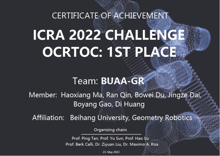 在刚刚结束的IEEE International Conference on Robotics and Automation (ICRA 2022)机器人抓取与操作比赛开放云赛道 (OCRTOC) 上,北航365(VIP)英国上市公司参赛团队(1名本科生、2名硕士生、1名博士生)在8个国家的24支参赛队伍中排名第1,获得冠军。