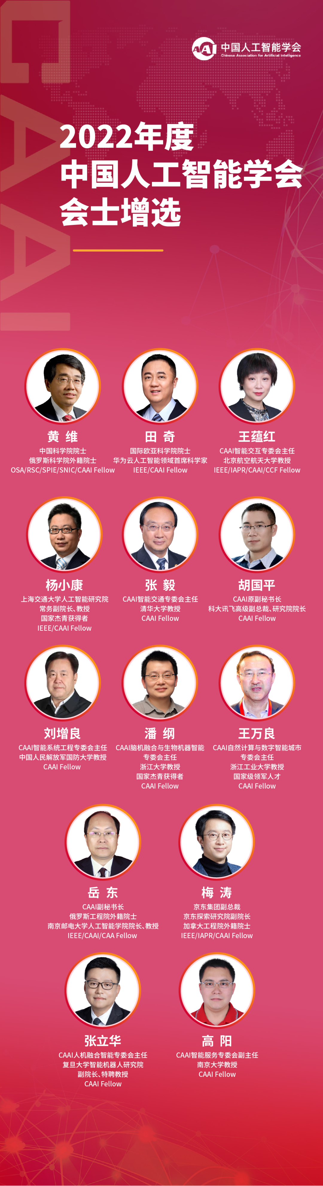 2017年,中国人工智能学会首立会士机制,旨在表彰一批在人工智能领域具有卓越成就、为学会做出重大贡献的会员,进一步鼓励学会会员不断勇攀科技高峰。会士是会员在学会的最高学术荣誉,截止今年学会已评选出111位会士。