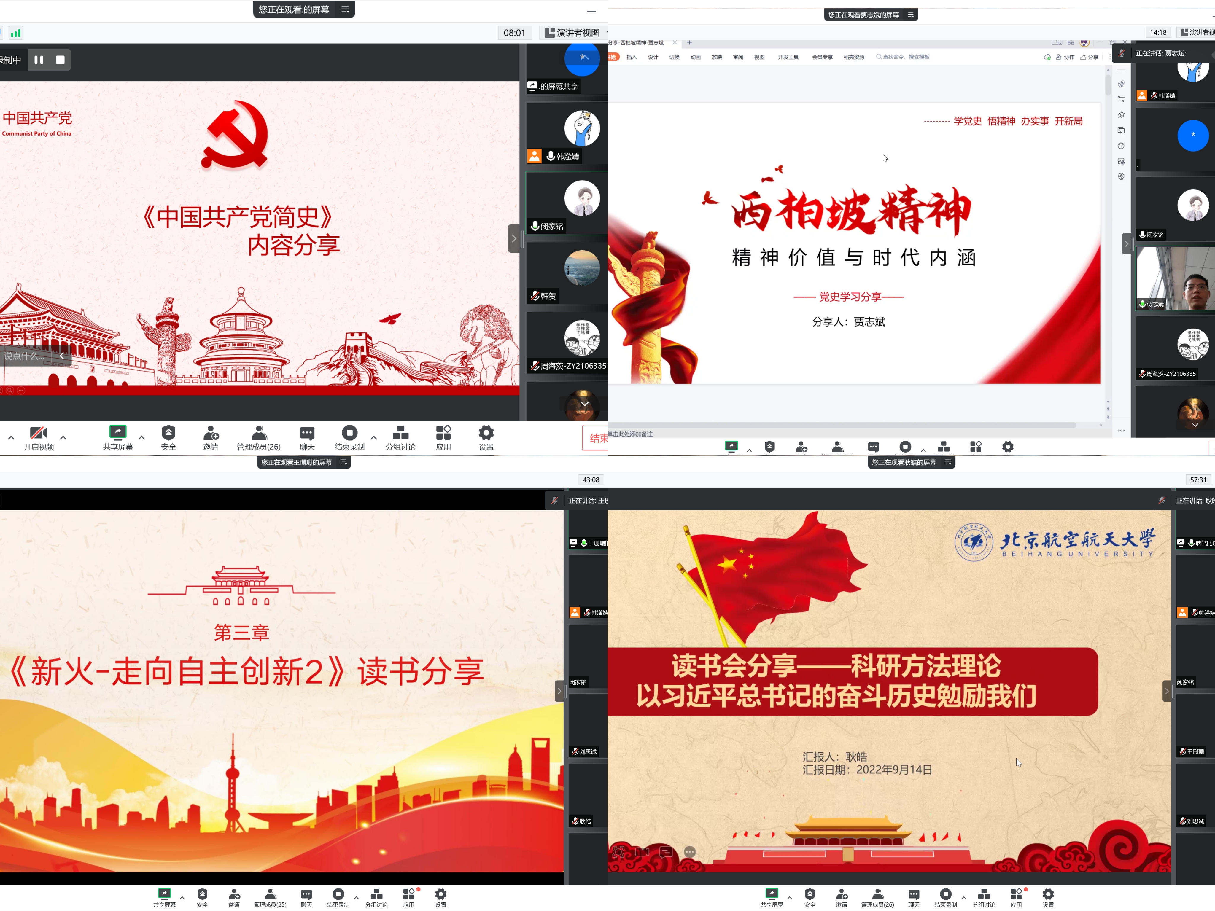 活动分为“学党史、学校史、话科技、话科研”四个专题。在“学党史”专题中,同学们先后分享了《中国共产党简史》的学习感想和西柏坡精神的相关内容。在“学校史”专题中,同学们从时间轴、知名校友、故事情景等多个角度回顾了北航的历史发展,学习一代代北航人的先进事迹,感受他们身上闪耀的空天报国精神。在“话科技”专题中,刘思诚同学介绍了中国航天从“东方红”到“长征火箭”再到载人航天工程的辉煌发展历程。王群莹和王珊珊同学分享了《走向自主创新》这本书的读书心得,提出自主创新是中国企业和工业获得竞争优势和实现技术突破的唯一途径。最后,在“话科研”专题中,同学们从方法论的角度进行了科研经验分享,基于对《习近平的七年知青岁月》一书的阅读体会,提出我们要像习近平总书记一样,树立不畏艰难、刻苦钻研的科研精神。
