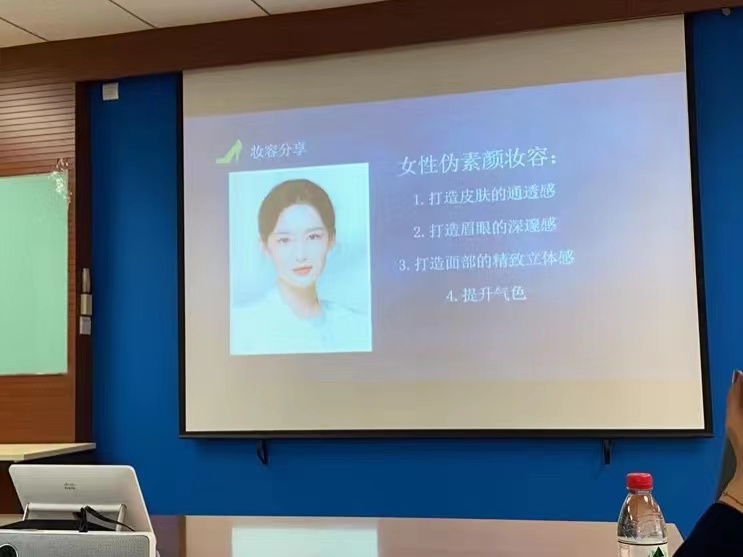 气质提升活动在轻松氛围中展开,专业化妆师结合女性教职工生活和职业特点,结合前期调研过程中,各位教工反馈的“素颜、教师气质”等多样化需求,现场为大家讲解了妆容步骤,分享了适合不同肤质的化妆产品,通过视频介绍了口红发展的历史。随后,化妆师邀请两名女教师作为模特,为她们现场上妆,帮助大家在实践中巩固所学的化妆技巧。活动现场气氛活跃,大家纷纷表示今后将多多实践,尽情展示新时代中国新女性的自信、优雅和美丽。