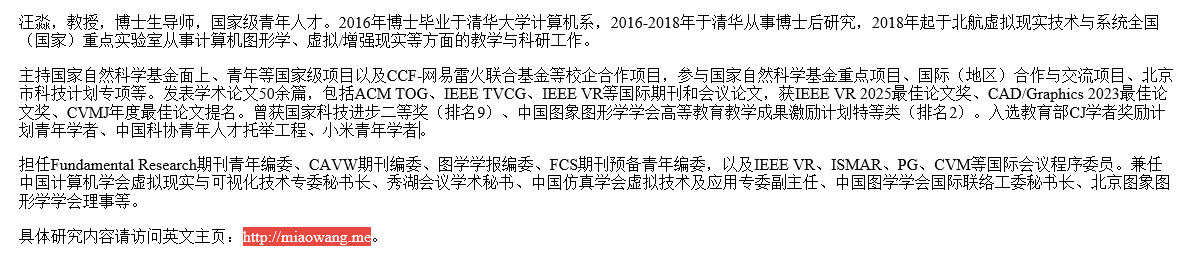 姓名:Wang Miao 职称:Professor 座机: 邮编:100191 办公地址:北京航空航天大学新主楼 电子邮箱:miaow@buaa.edu.cn 个人主页:https://shi.buaa.edu.cn/wangmiao